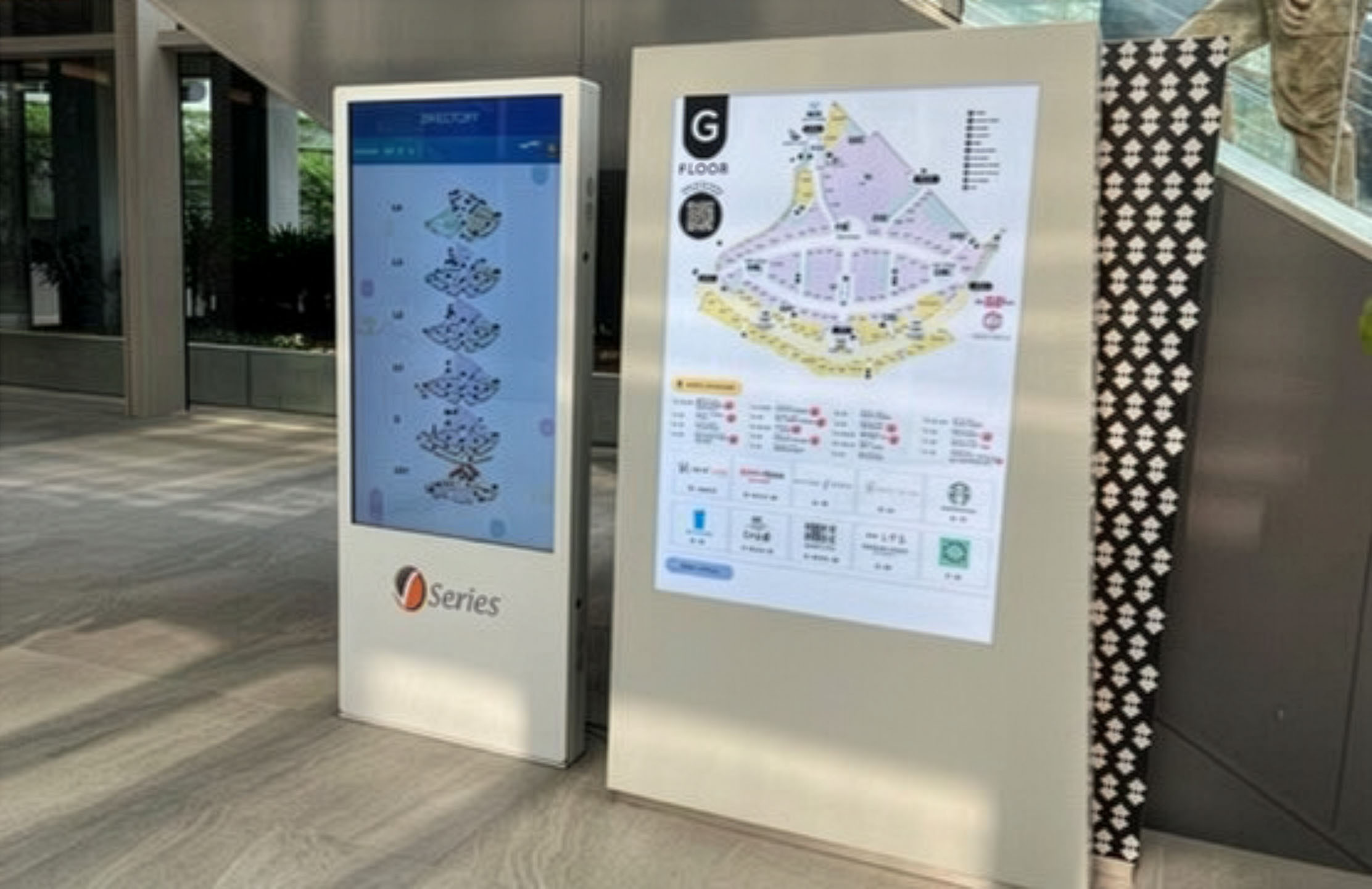 55″ indoor touchscreen standee with a slim, modern design integrated with the VigitWFS wayfinding system, seamlessly blending into the mall environment.