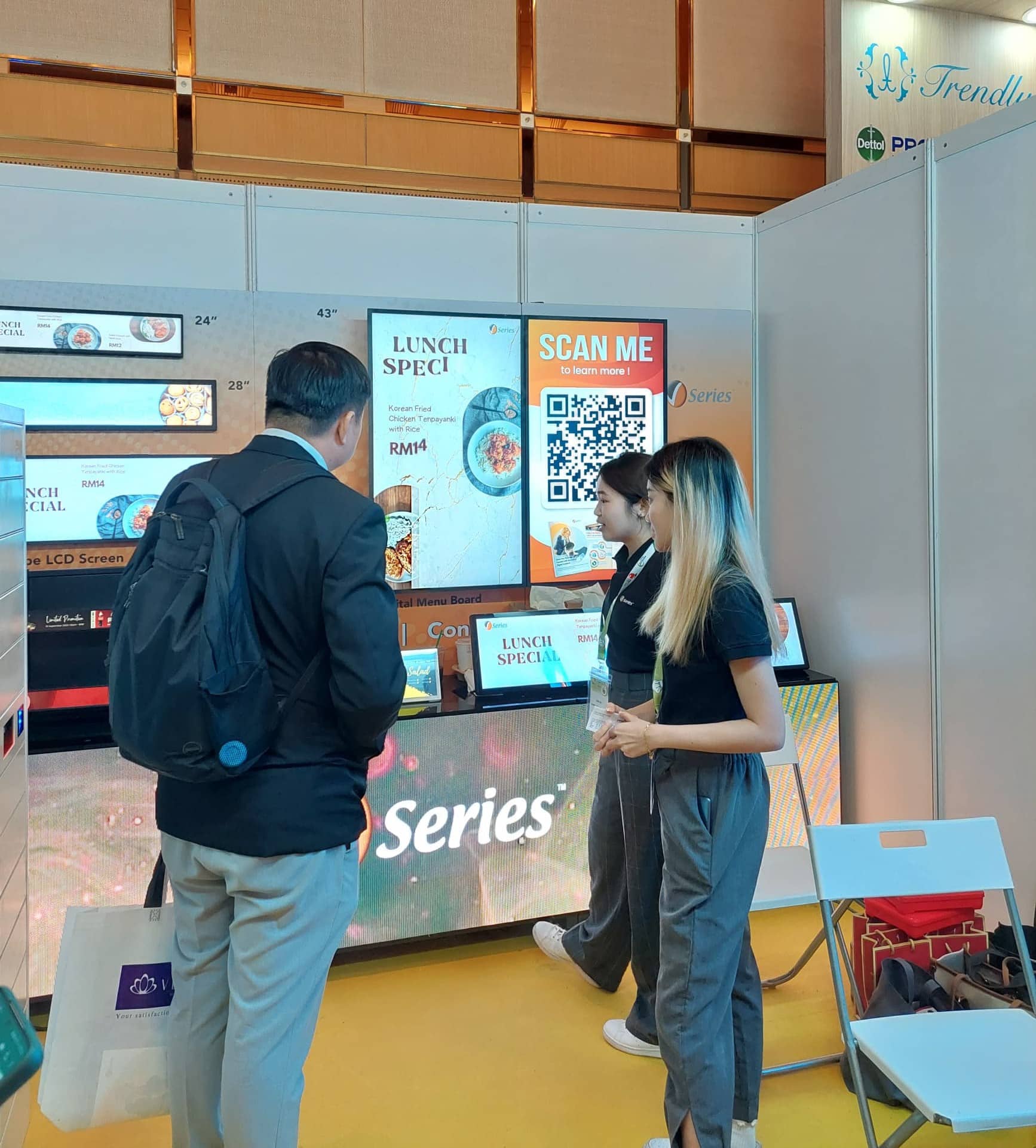 Serving as a captivating centrepiece, V-Series’ Round Pop LED and P2 LED Display have left a lasting impression on visitors. Equipped with industrial-grade LED panels, our LED displays promise an enhanced viewing experience with high resolution and high brightness, illustrating our dedication to delivering high-quality visual solutions. In addition, V-Series have introduced Interactive Service Kiosk equipped with PCAP Touchscreen Technology that supports multi-touch commands with high sensitivity, redefining guest interaction and enhancing user experience.