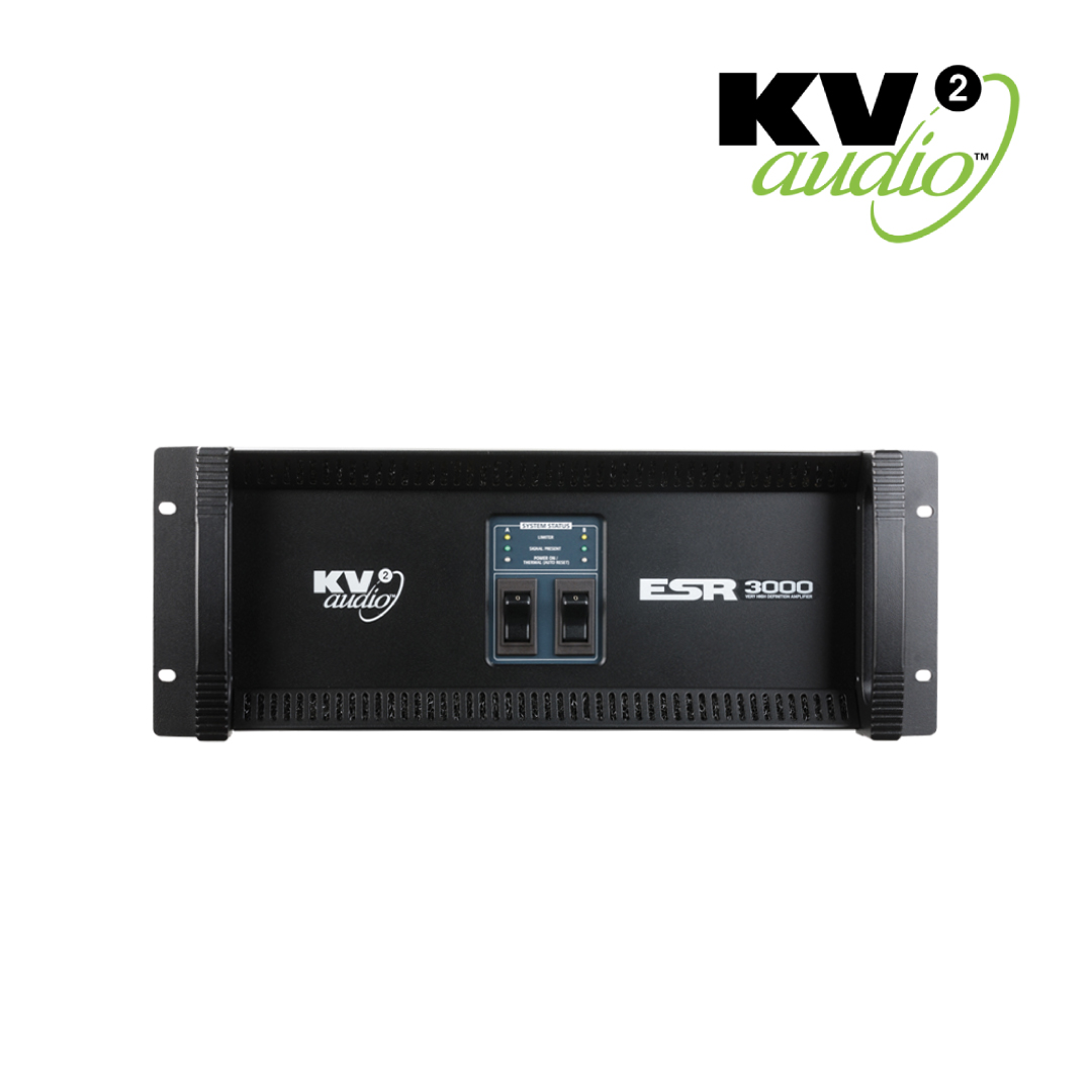 The ESR3000MkII is three-way, active control and amplification system specially designed for the KV2 Audio ESR full range series loudspeaker systems. It houses all signal processing, amplification and subwoofer crossover function if required, utilising an external subwoofer amplifier. The ESR3000MkII powers the ESR215MkII. Each unit incorporates six amplifiers consisting of two 100-watt, Class AB, push pull, low intermodulation amplifier for high frequencies, two 200-watt, Class AB, push pull, low intermodulation design for mids and two a 1000-watt, high-efficiency, currentenhancing switch mode technology amplifier for bass. The ESR3000MkII stereo configuration powers two ESR cabinets accordingly.