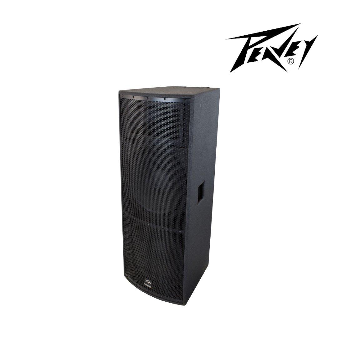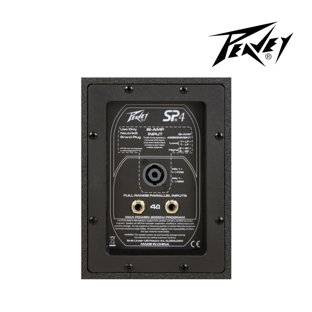 The SP 4 is a quasi‑three‑way, full‑range, bi‑ampable sound‑reinforcement system. It features two premium 15″ Black Widow® woofers with 4″ voice coils, an RX 22CT compression driver and utilizes Peavey’s exclusive “Quadratic Throat Waveguide™” asymmetrical horn design. The horn is engineered to aim coverage 15° upward and 35° downward to better focus the sound toward the audience rather than over their heads.