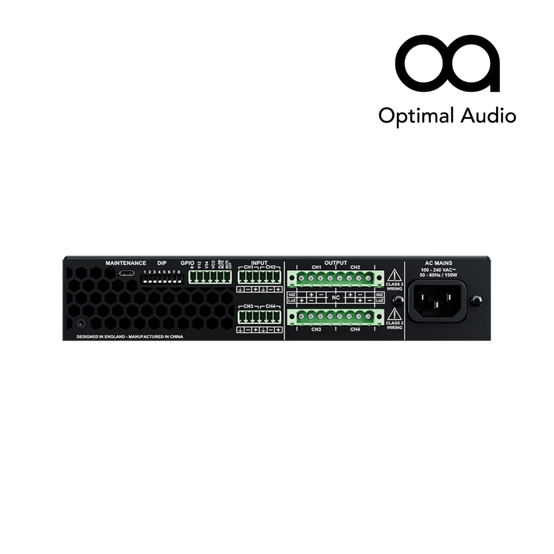 This four-channel power amplifier can drive either conventional low impedance or 70V – 100V loudspeaker loads. Internal DSP presets of Optimal Audio loudspeakers are selected by switches to the rear of the amplifier, which enable the appropriate EQ and overload protection settings.